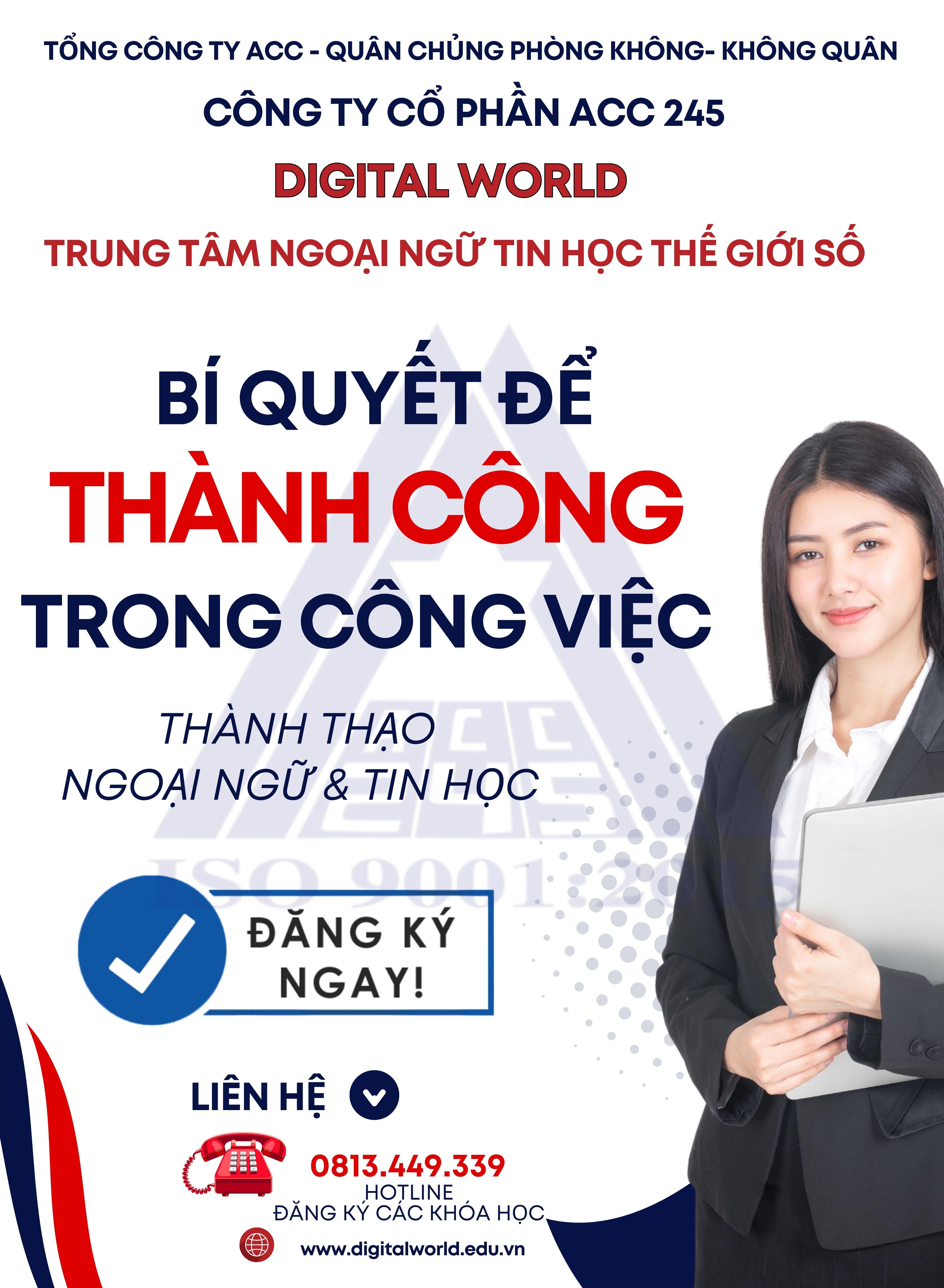 Đến với Trung tâm Ngoại ngữ Tin học Thế Giới Số – Digital World, tọa lạc tại số 14 Lam Sơn, Phường Tân Sơn Hòa Thành phố Hồ Chí Minh. Chúng tôi tự hào là nơi đào tạo ngoại ngữ và tin học uy tín, với đội ngũ giảng viên chuyên nghiệp, giàu kinh nghiệm. Môi trường học tập hiện đại, thân thiện, phương pháp giảng dạy sáng tạo giúp học viên phát triển toàn diện kỹ năng. Hãy cùng Digital World chinh phục tri thức và mở rộng cơ hội tương lai!